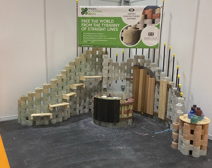 McKie's Rotational Bricks™ are a UK-patented, innovative building system to simplify and reduce the cost of constructing structures with complex footprints. Unlike traditional brickwork, which is labour-intensive and technically demanding for curves and irregular layouts, each Rotational Brick can be easily oriented at any angle during construction, while maintaining a plumb wall.